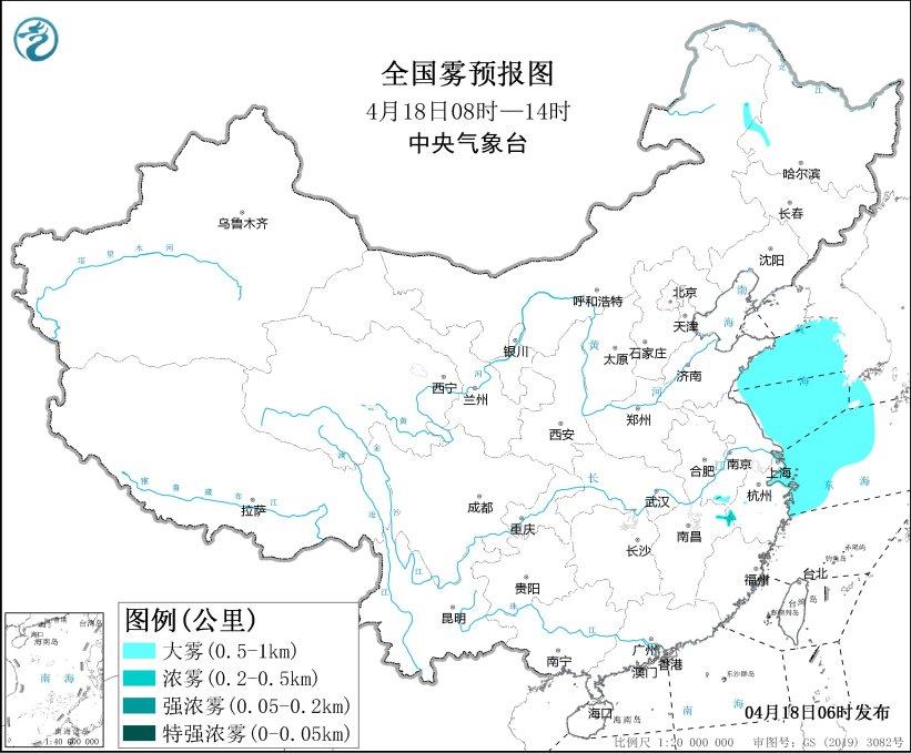 预计,4月18日白天至夜间,黄海中部和南部海域、东海北部海域、长江口及杭州湾附近海域、舟山群岛附近海域、青岛港、上海港、宁波港将有大雾;此外,4月18日早晨至上午,安徽南部、江西东部、浙江西部、黑龙江西部、内蒙古东北部等地的部分地区有能见度不足1公里的大雾,局地有能见度不足500米的浓雾。