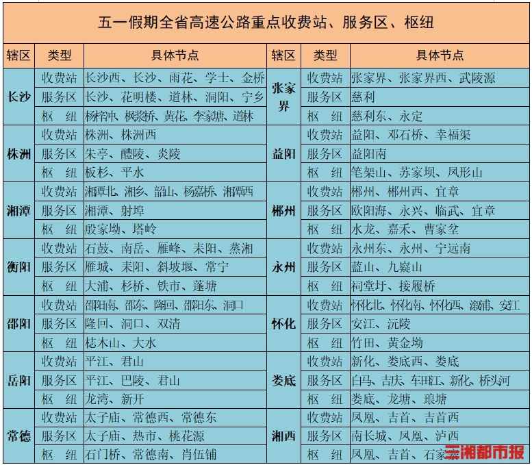 预测假期长沙、岳阳、衡阳辖区收费站的车流量排全省前列。环长沙周边高速收费站的车流量排全省前列。南岳、凤凰、岳阳东、张家界、韶山等收费站的车流量排全省景区收费站前列。