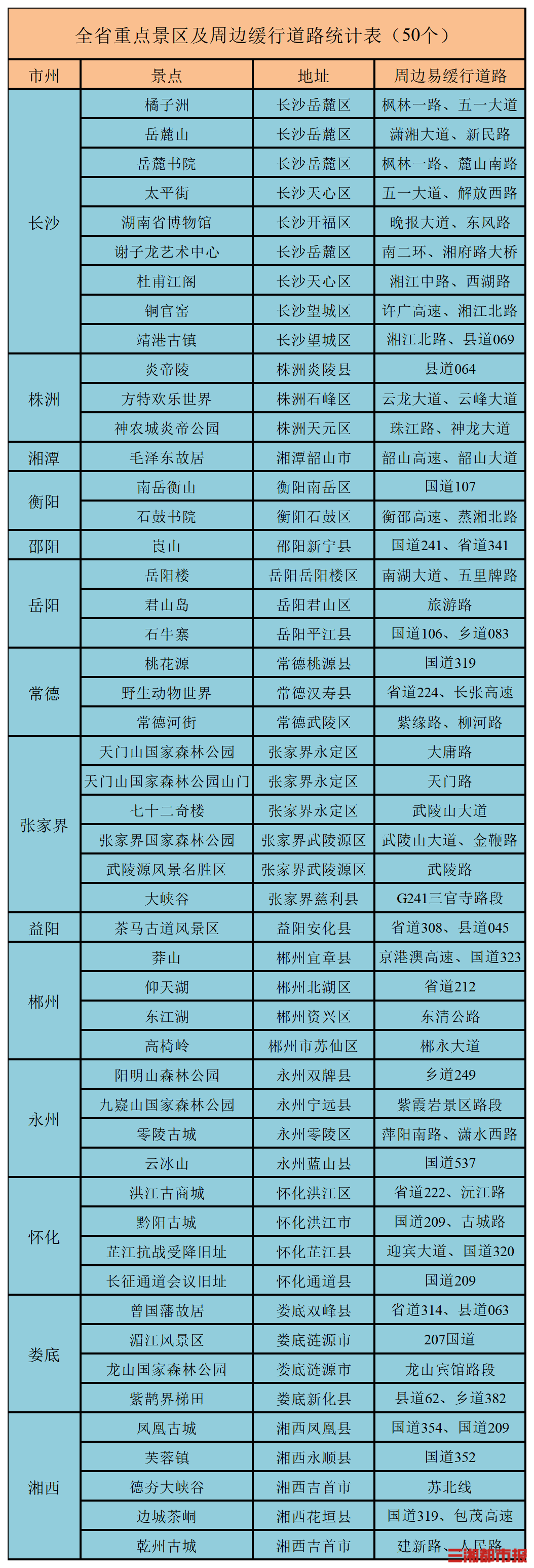 预测橘子洲、岳麓山、韶山、南岳衡山、武陵源、凤凰、矮寨德夯大峡谷、芙蓉镇、莽山、东江湖、高椅岭、岳阳楼、石牛寨、桃花源、常德野生动物世界为热门旅游景区,因人流车流较大,周边道路易出现交通缓行。