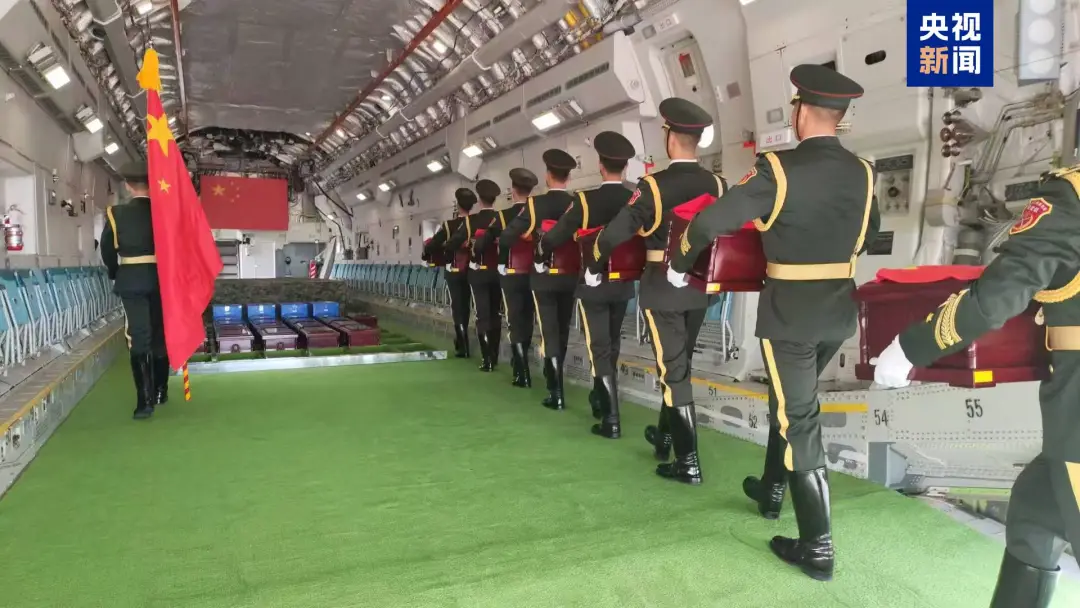 中方在仁川国际机场举行庄严悼念仪式,唱响激昂雄壮的中华人民共和国国歌《义勇军进行曲》,中国驻韩国大使为志愿军烈士棺椁一一覆盖国旗,全体人员向志愿军烈士遗骸行三鞠躬礼,中国人民解放军仪仗司礼大队礼兵手持国旗引路,怀抱烈士棺椁登上解放军空军“运-20”专机,烈士英灵在国歌声中回到祖国和人民怀抱。