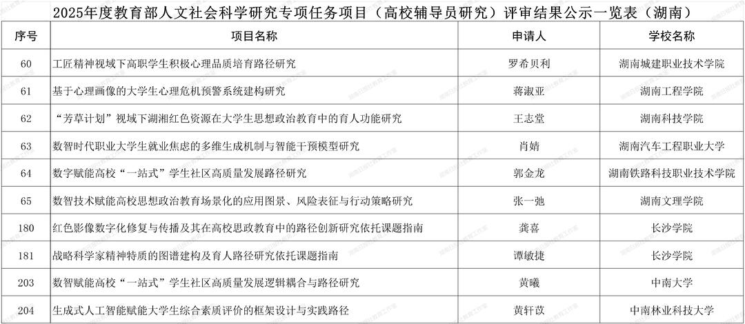 记者对该公示结果进行了统计,湖南在规划基金、青年基金、自筹经费项目评审公示结果中,共36所高校的112个项目入选:长沙理工大学13项,中南大学11项,长沙学院10项,湖南师范大学9项,湖南大学8项;在专项任务项目(高校辅导员研究)评审公示结果中,共9所高校的10个项目入选:长沙学院2项,中南大学、中南林业科技大学等8所高校各1项。