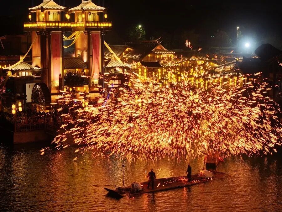 ▲衡阳市南岳区举行南岳里庙会民俗活动,当地居民通过舞龙舞狮、打铁花等丰富多彩的非遗活动,迎接中秋佳节