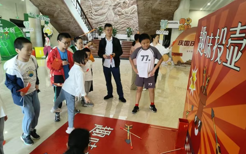 ▲国庆中秋长假,游客在岳阳市博物馆内体验蹴鞠挑战赛、趣味投壶、古法月饼制作等互动体验活动