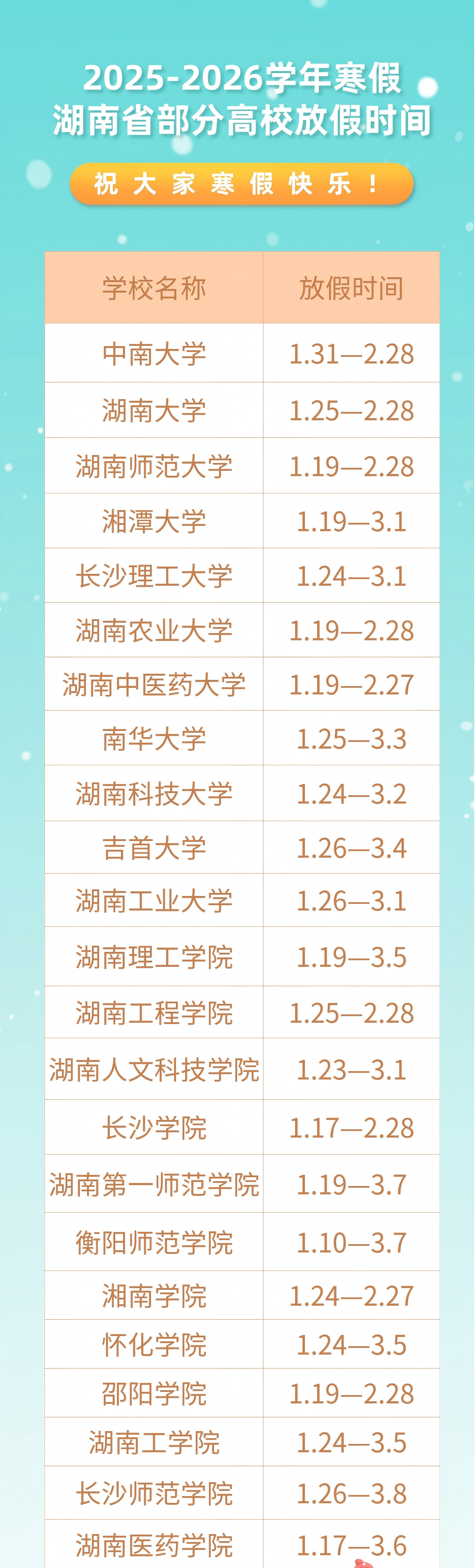 “同步启停”小分队:湖南师范大学、湖南农业大学、邵阳学院3所高校,寒假起止时间完全一致,均为2026年1月19日放假、2026年2月28日开学,连时长都定格在41天。
