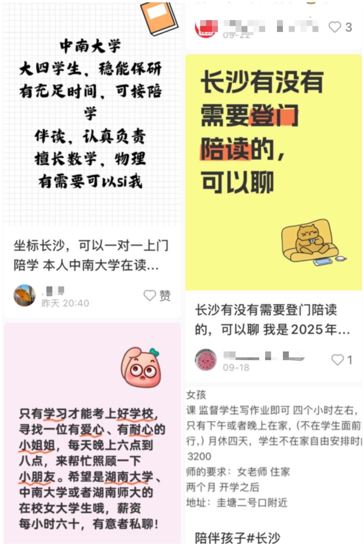 记者观察到,“大学生伴读”正成为越来越多年轻家庭的新选择。在社交平台上,大学生伴读价格在20元至60元一小时不等,价格便宜的工作内容相对简单,主要起看护作用,价格贵的则还包括作业辅导等服务。
