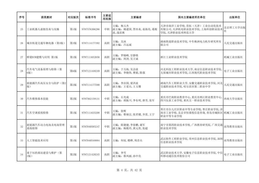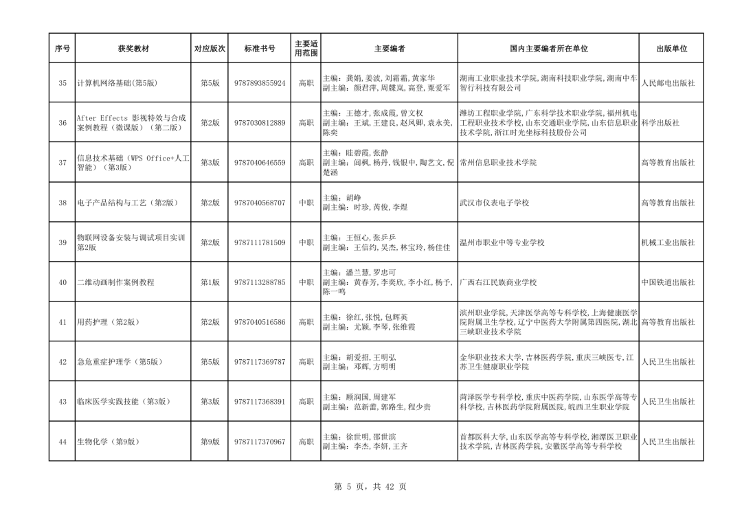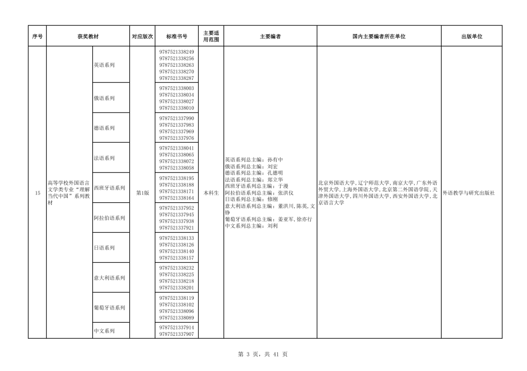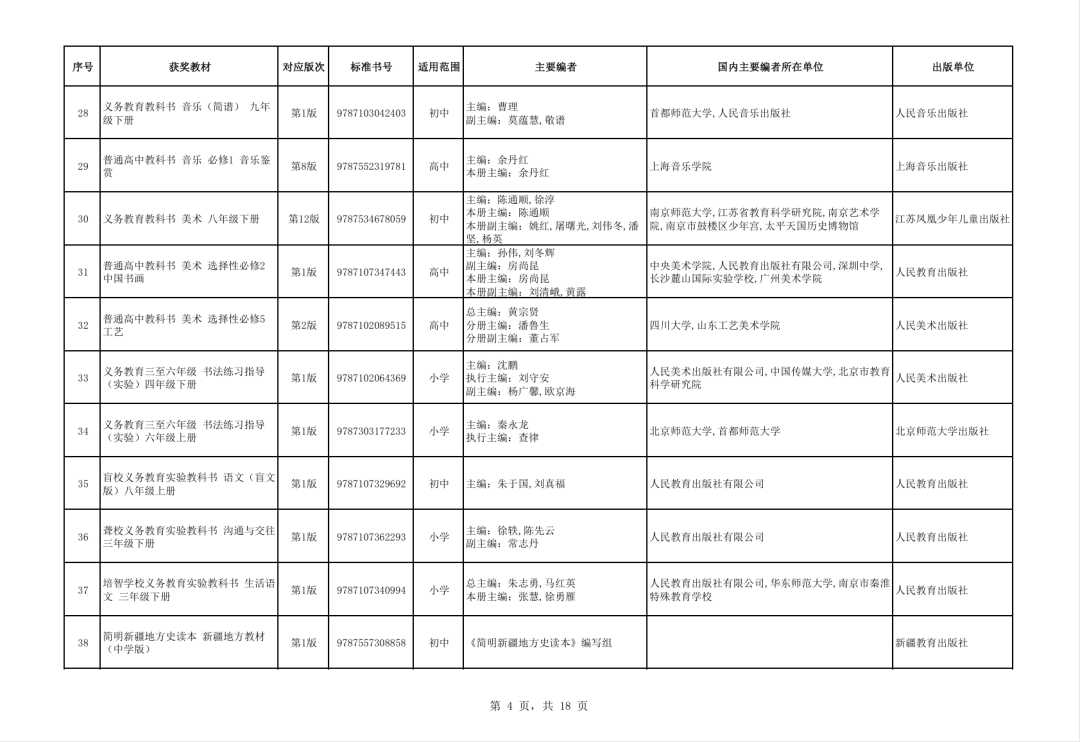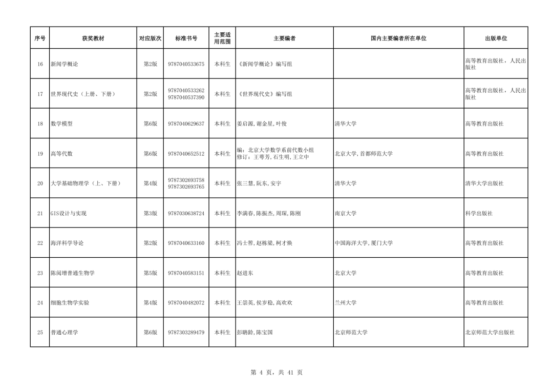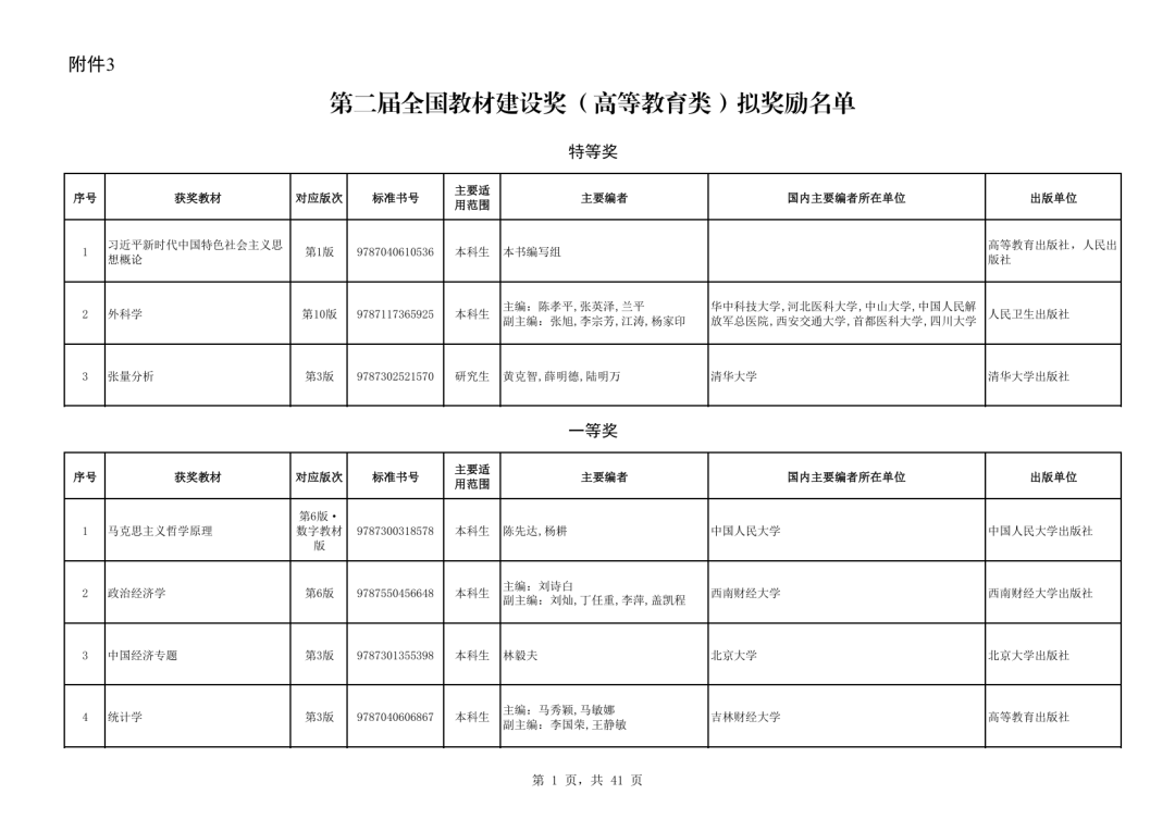 根据国家教材委员会关于开展第二届全国教材建设奖评选工作的部署安排,经出版单位申报、地方初评推荐、国家初审、地方公示、国家复审等程序,拟奖励全国优秀教材989种(基础教育类192种、职业教育与继续教育类400种、高等教育类397种)。现将拟奖励名单予以公示,公示期为2025年11月3日至2025年11月28日。
