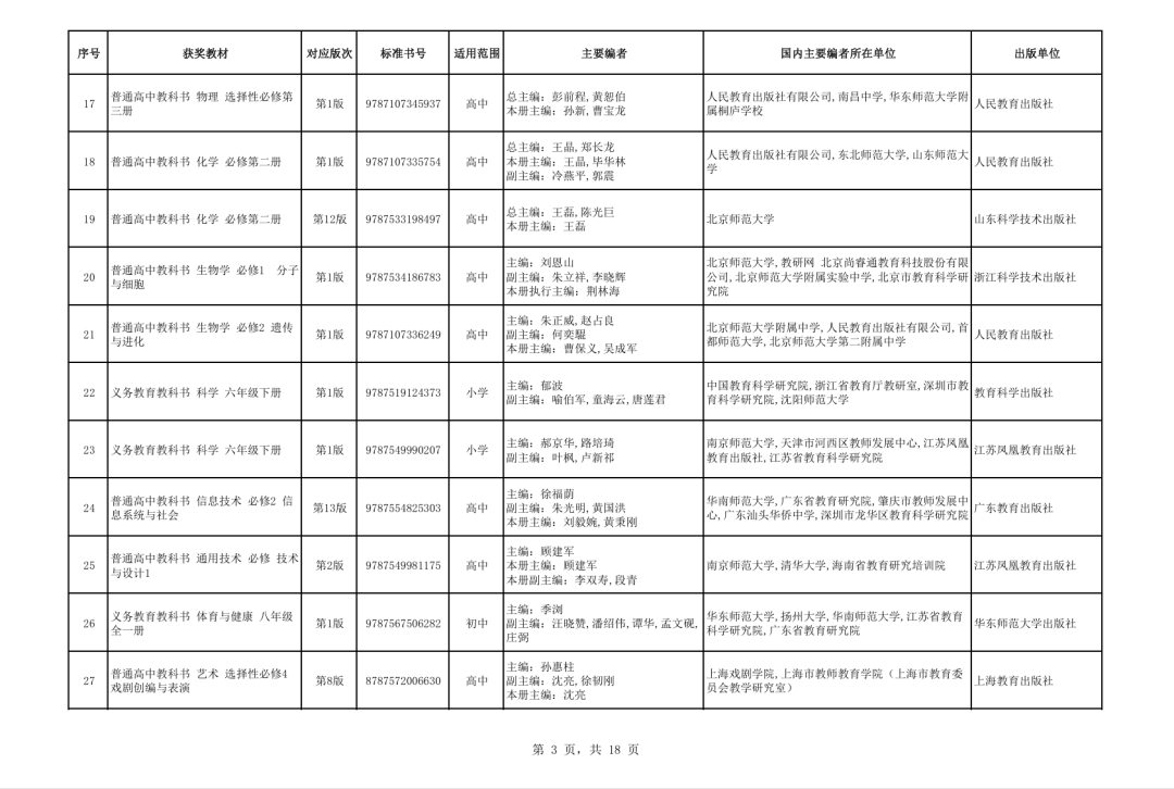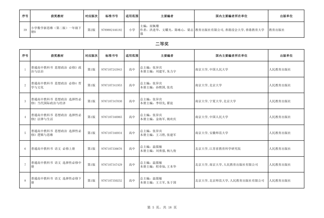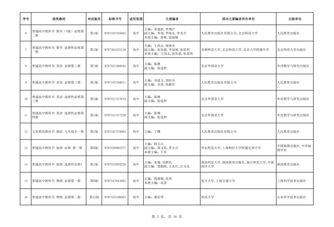 第二届全国教材建设奖(基础教育类)拟奖励名单(部分)