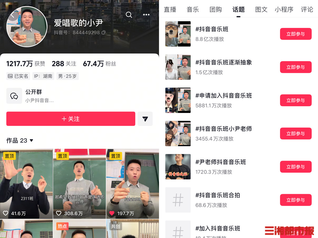 “2305班,到!一起来,唱歌!”近日,“申请加入尹老师的抖音音乐班”的话题登上短视频平台热点榜,吸引了不少网友互动参与。话题发起人“爱唱歌的小尹”原名尹碧文,是一位来自长沙的“00后”小学音乐老师。在短视频平台其主页所有视频中,尹碧文都会打着节拍“喊麦”,小学生们就会像漫画角色乌萨奇那般热情地喊“到”,积极回应。