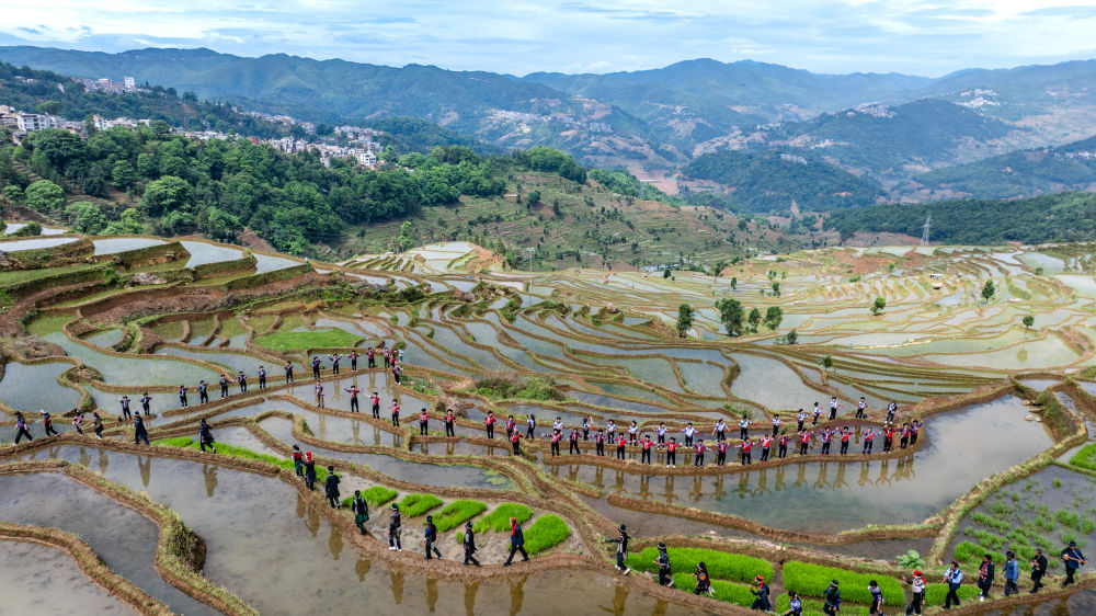 2025年5月2日,在云南省红河县甲寅村“开秧门”仪式上,村民身着民族服饰,沿着田埂踏歌而行(无人机照片)