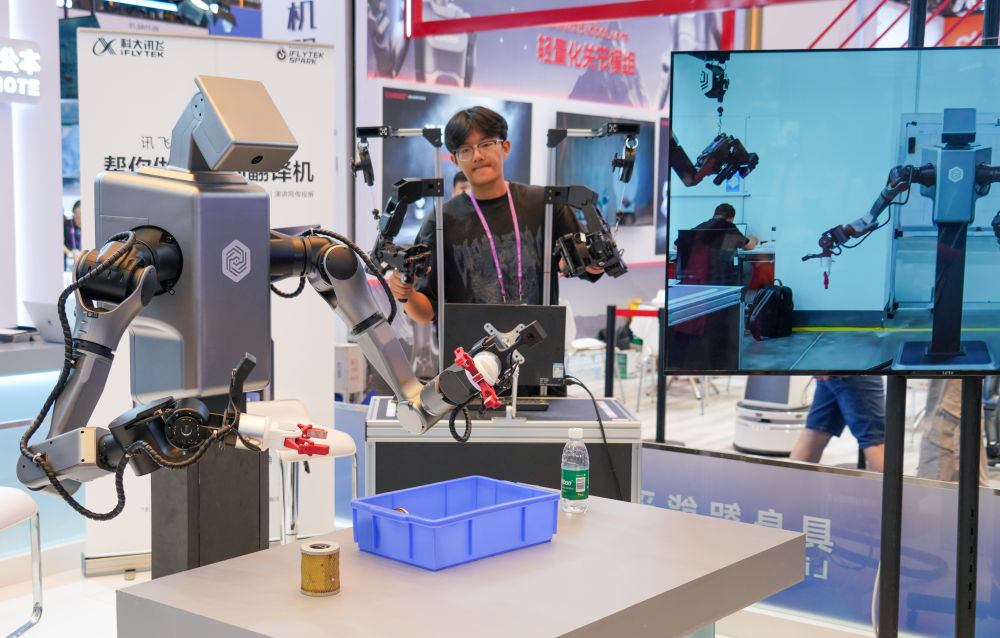 2025年10月16日,工作人员在第138届广交会科大讯飞展台操作机器人拿取物品