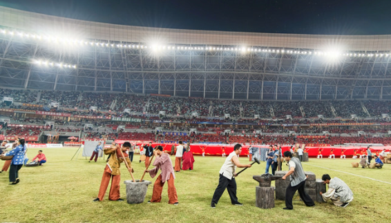 2025年11月2日,赣州市全民健身体育中心体育场,“赣超”决赛暖场节目再现“寻乌调查”历史场景