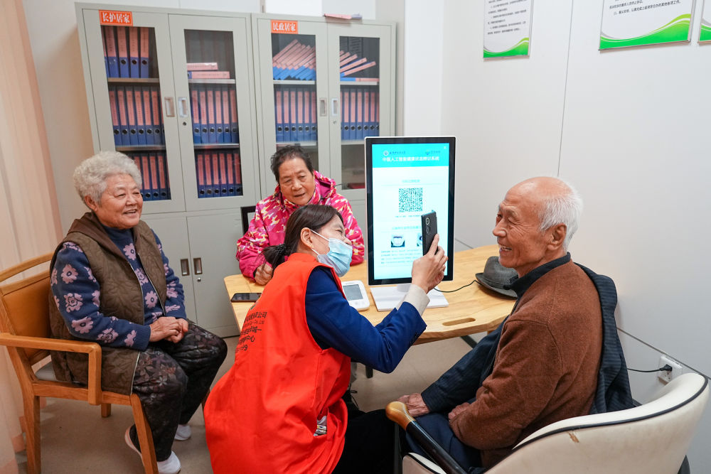2025年10月23日,老人在山东省淄博市张店区马尚街道金石社区日间护理中心测量健康数据