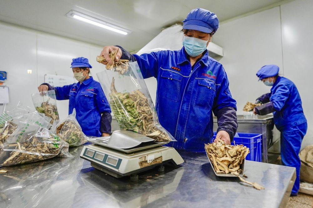 2026年1月26日,工作人员在宁夏固原市隆德县一家药材加工企业分包当归