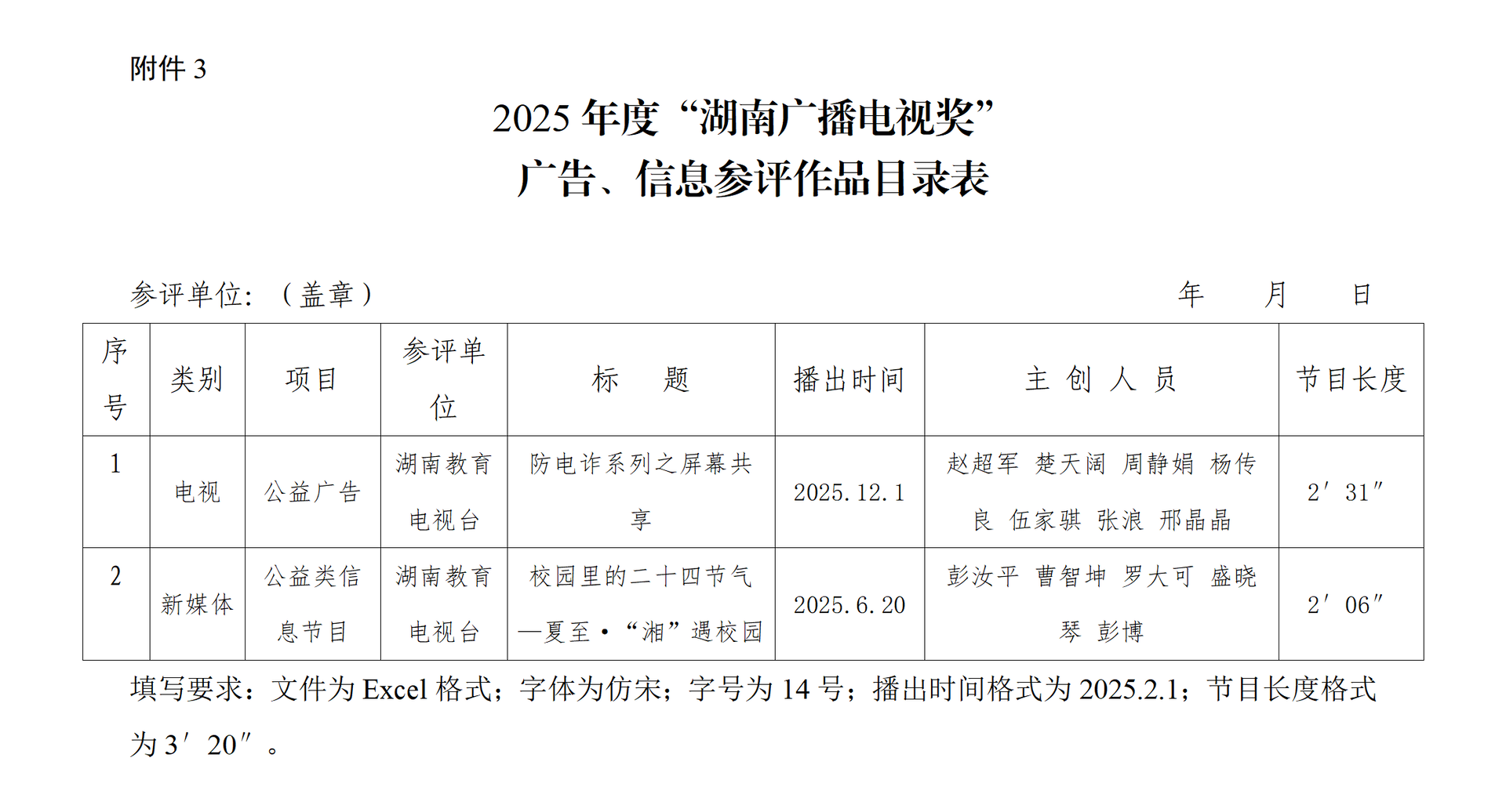 根据湖南省广播电视协会、广告信息专业委员会的要求,经我台推荐委员会认真评议,拟选送《防电诈系列之屏幕共享》、《校园里的二十四节气—夏至·“湘”遇校园》》二部作品参加2025年度“湖南广播电视奖”广告、信息作品评选,现公示如下,接受全台员工监督。公示时间2025年3月20日—3月25日,共5个工作日。