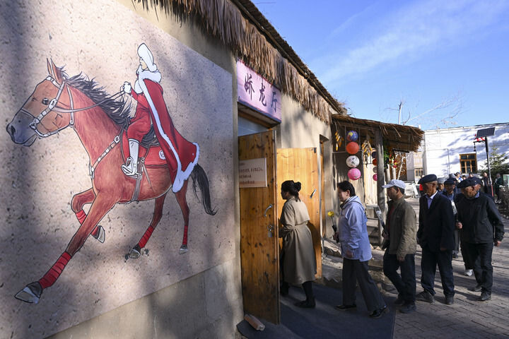 2026年4月3日,人们排队进入新疆昭苏县灯塔知青馆娇龙厅献花,追忆贺娇龙同志为当地经济社会发展、文旅品牌打造、农牧民增收致富作出的贡献