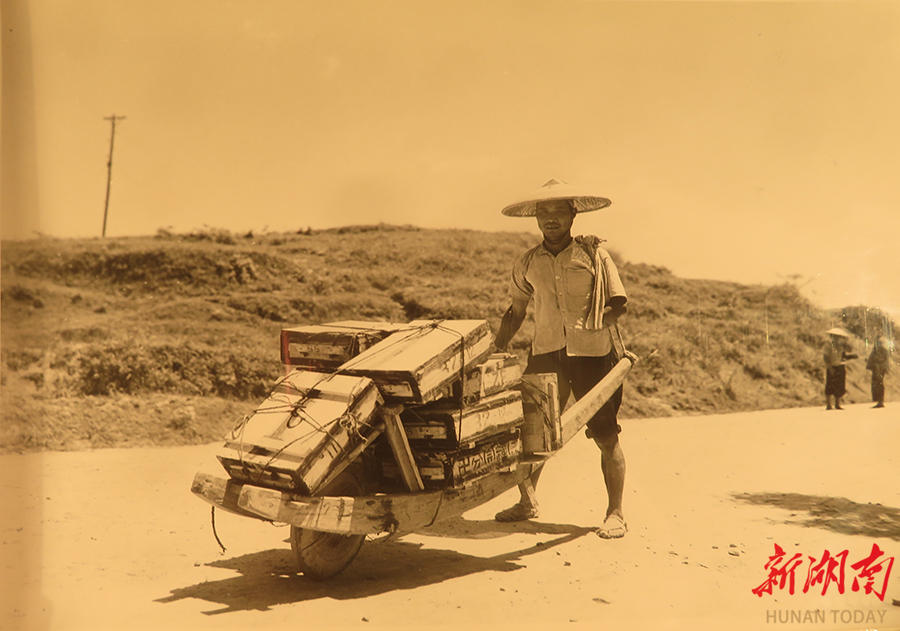 1945年5月6日,湘西会战前线,炎炎烈日下,一名男子正用仅存的一只手臂艰难地推着满载弹药的独轮车