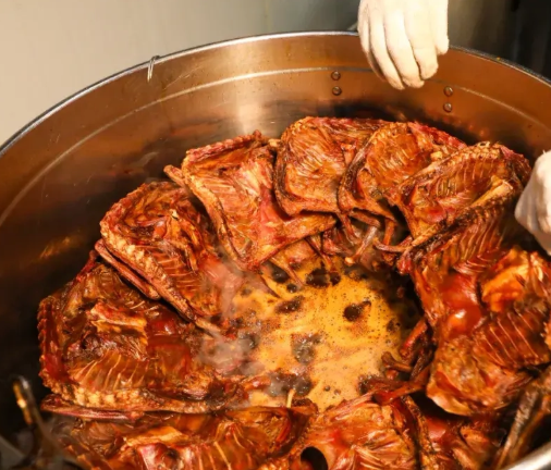 株洲酱板鸭以醴陵酱板鸭为核心,传承古法又兼具烟火气。当地匠人选用一年以上散养赤麻鸭,以十八味中药材腌制,坚守“腌制—炭烤—卤制”24小时匠心流程。炭火慢烤逼出多余油脂,老卤熬煮让滋味深入肌理,成品色泽深红、酱香浓郁,口感韧而不柴、干香劲辣。近年来,以仙都、六娘子、润香源为代表的品牌,将非遗草本老卤技艺与现代工艺结合,保留最纯粹的湘辣本味,成为街头最具代表性的烟火风味。