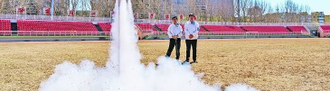在哈尔滨工业大学体育场,航模协会的学生操控航模点火发射。