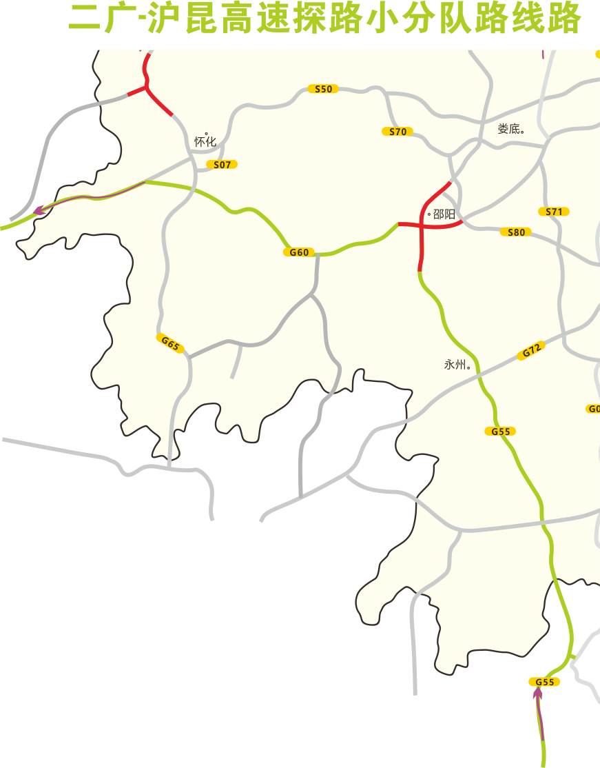 小分队途经永州观音岭隧道群、蓝山服务区、阳明山隧道群、邵阳梽木山枢纽、隆回服务区至洞口服务区、雪峰山隧道群、安江段的路段时遇到较长距离的缓行情况,整体通行情况有序。