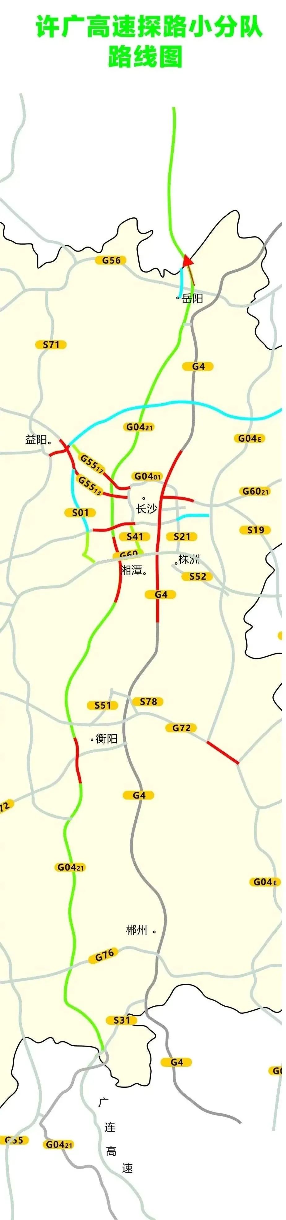 G0421许广高速探路小分队于2月3日8点40从湘粤省界出发,最终用时11小时,共行驶528公里到达目的地。途中黄沙互通段、宜章西服务区、欧阳海服务区附近因车流量大出现缓行,其他路段畅通。